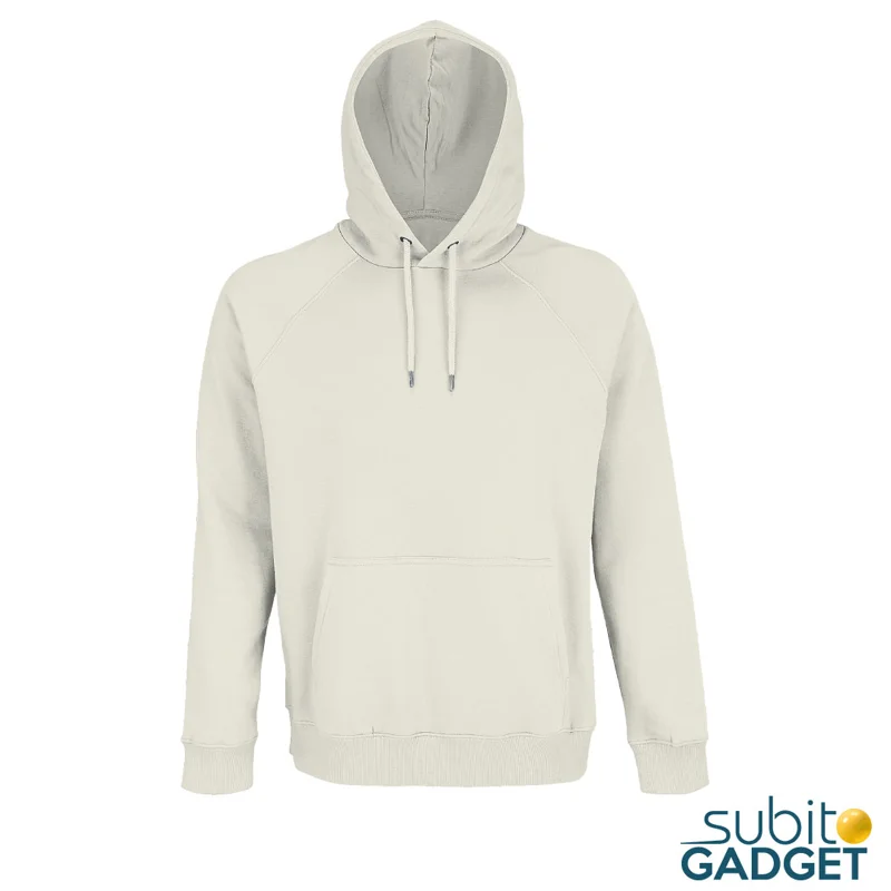 Felpa unisex con cappuccio, tagliata e cucita, maniche raglan, polsini e fondo del capo a costina 2x2. Mezzaluna sul collo, nastro di rinforzo sul collo, cordini con occhiellie e stopper in metallo, cappuccio foderato in jersey.